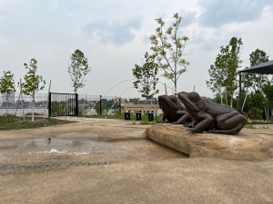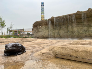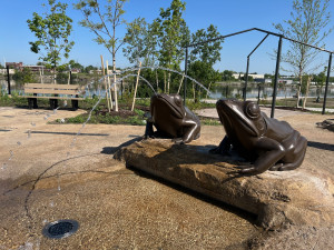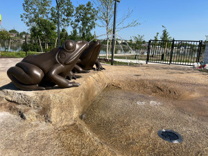These bronze frogs and toads are scattered around the Mini Maumee water park at Glass City Metropark. Four of the frogs include water features that “spit” water from the mouths of each frog. There are numerous smaller bronze frogs and toads placed around the water park.