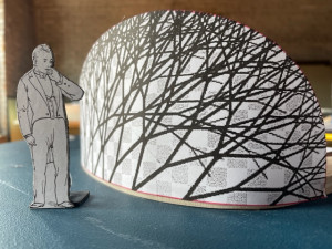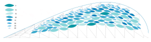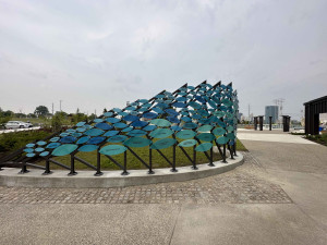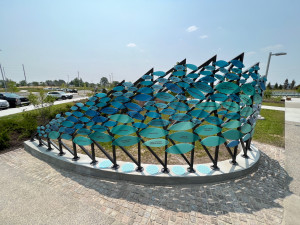 The donor wall for the Glass City Metropark is a large free-standing steel structure with water-shaped acrylic pieces arranged in a wave patter to highlight the names of those who donated to the new park.