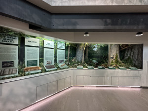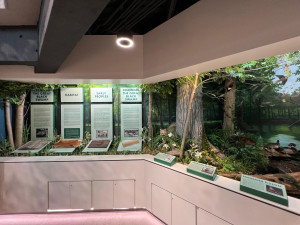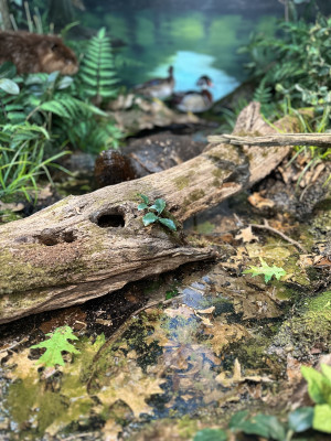 This diorama gives a glimpse into the thick, impassable ground of the Great Black Swamp before it was drained by early settlers. The trees were built using molds of real bark found in the wetland and the plants, taxidermy, and painted wildlife are all reminiscent of native species found in the swamp.