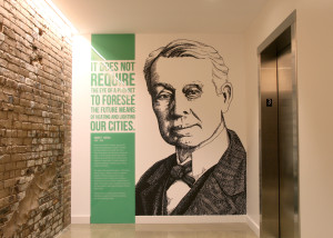 The printed murals are installed inside of the new Promedica headquarters building in Toledo, OH. It highlights influential people from the area and explains their importance in the development of the city.