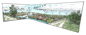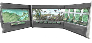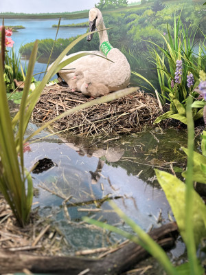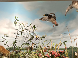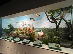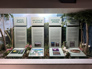 This diorama shows what the ecosystem of the Magee Marsh wildlife area looks like today. Native plants, invasive species, and wildlife are brought to life through sculpture, taxidermy, and murals to highlight a typical scene in the wetland today.