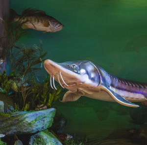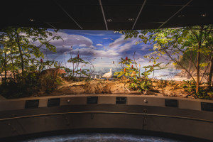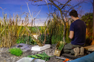 The Wetlands and Lakes room features a perimeter of dioramas that highlight open water, beneath the water, forested beach ridge and wetlands of Lake Erie. Each diorama includes carefully placed taxidermy, sculpted animals and environments, murals, and interactive sound effects. The center of the room features a large wetland scene aquatic tank that includes a sculpted base and live animals.